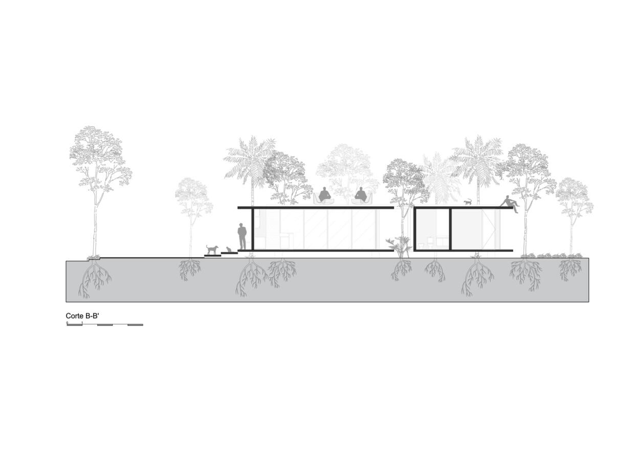 La composición espacial se desarrolla a través de dos planos horizontales diferenciados. El plano principal, el suelo, se eleva sutilmente, permitiendo que las raíces de los árboles evolucionen libremente con el tiempo. En paralelo, el plano secundario, el techo, replica esta geometría para conformar una terraza que invita a los ocupantes a disfrutar de vistas panorámicas de las copas. En última instancia, el proyecto imagina un futuro en el que las fronteras entre arquitectura y naturaleza se disuelven: un futuro en el que el entorno construido resulta tan orgánico como su contexto natural. Esta visión no solo propone una solución espacial diferente, sino que ofrece también un recordatorio del potencial de coexistencia y equilibrio. Así, en unísono, todos los elementos de la vivienda componen una big band que, según la estación o la hora del día, interpreta la música que mejor acompaña la experiencia.