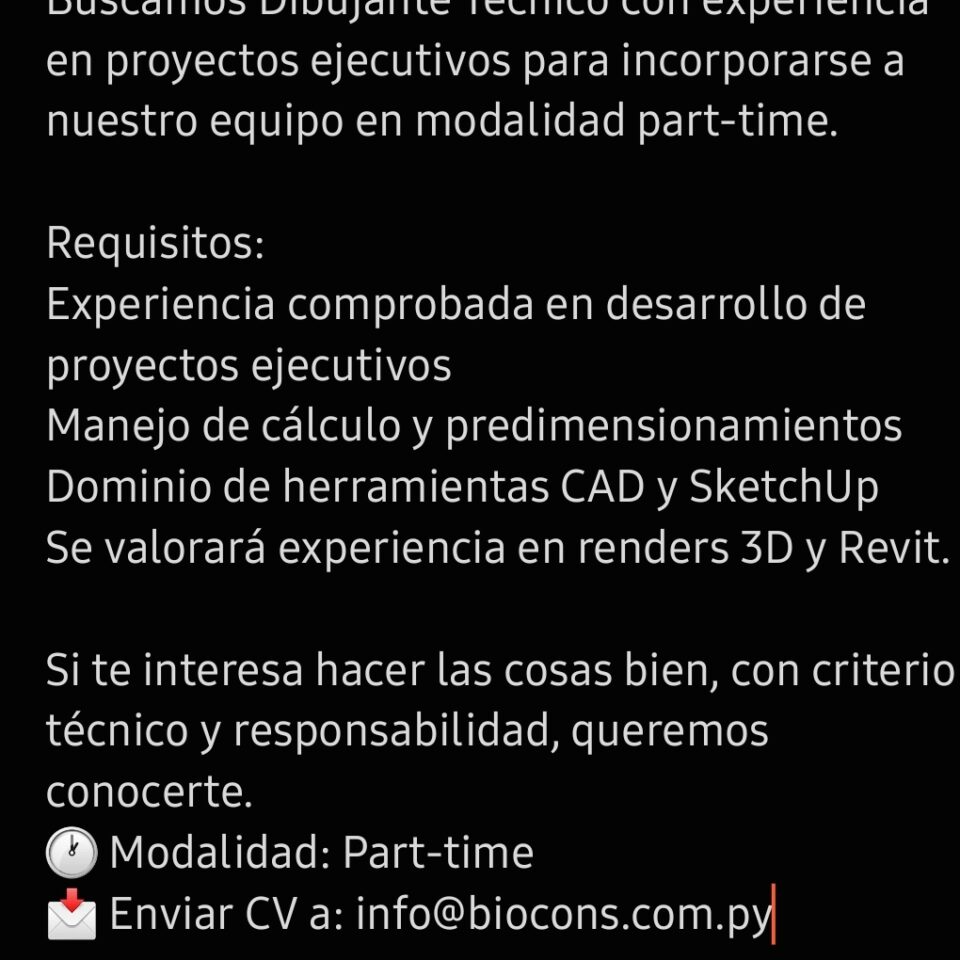 Buscamos Dibujante Técnico con experiencia en proyectos ejecutivos para incorporarse a nuestro equipo en modalidad part-time. Requisitos: Experiencia comprobada en ...